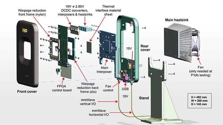 We needed to manage the heat flow in order to guarantee the lifetime of the IC. This was another reason to minimize warpage, because it meant we could use a very thin thermal-interface material (TIM). The TIM is often the item with the highest thermal resistance within the thermal chain, so the goal is to keep it as thin as possible. To simplify assembly, the TIM is applied globally over the heatsink interposer, which is the anchor for the demonstrator’s mechanical design. The demonstrator’s physical casing is removable, so all the internal connectors are easy to access. We found this very helpful when working in smaller, space-constrained antenna-measurement rooms.