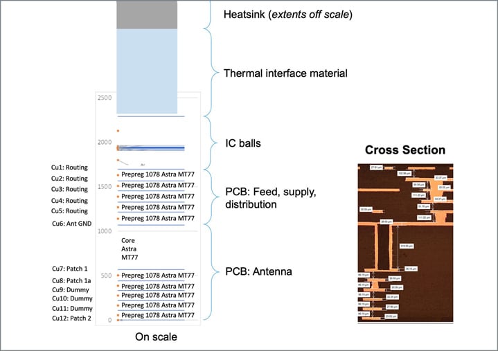 As shown in the diagram, the bottom six layers of the PCB create the antenna, and the top six layers manage the feed, supply, and analog and digital distribution.