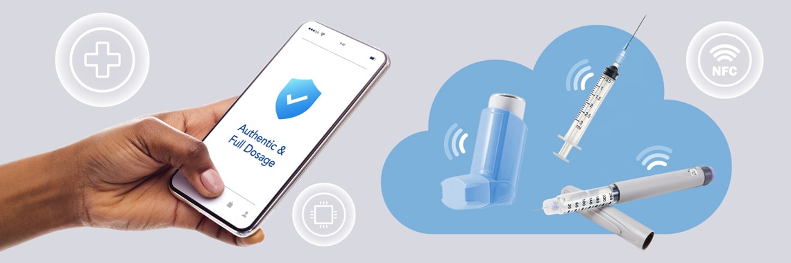 Authentication verifies that a device or its medication is genuine, securing access to an application or its data. While identification validates serial numbers using online allowlists, NFC-based authentication performs enhanced checks based on an item’s NFC tag data and credentials, using secure cryptographic functions. Authorization can further check attributes of each tag, such as ensuring rightful access of users to their data or delivery system.