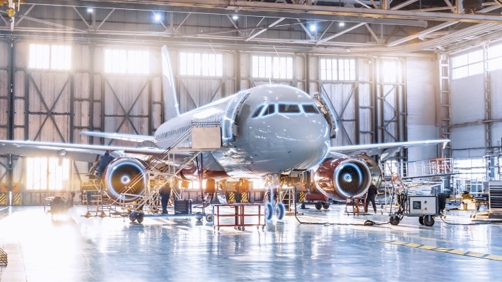 In this larger-scale example of airplane manufacturing, the fuselage of a passenger plane remains stationary, while the wing