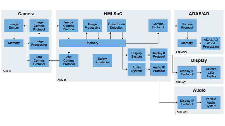 Functional safety also requires a robust concept addressing potential hazards—such as ASIL-B for camera/HMI system on chip (SoC), ASIL-C/D for ADAS/AD interface, ASIL-A/B for display/audio. Hardware/software safety mechanisms (such as redundancy, error detection and runtime monitoring) are combined. OS choice balances performance and safety (real-time operating system, or RTOS for performance and a safety-certified OS). The diagram below shows a separation between HMI SoC (Sense) and the ADAS/AD unit (Plan, Act). These elements enable a robust and efficient DMS.