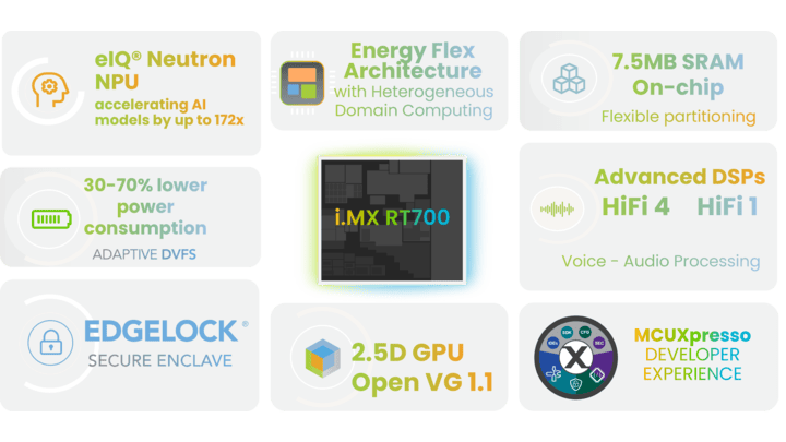 combination of general-purpose cores with high-performance DSPs and a powerful NPU make the i.MX RT700 unique in its