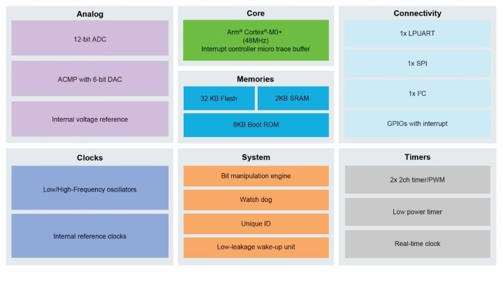 The power management controller (PMC) provides multiple power options to allow the user to optimize power consumption for the level of functionality needed. It supports multiple RUN/WAIT/STOP modes. The MCU can run at less than 50µA/MHz and can run at 2µA with Deep Sleep Idd with register retention. When in deep sleep mode, the microcontroller can wake up in just 4us.