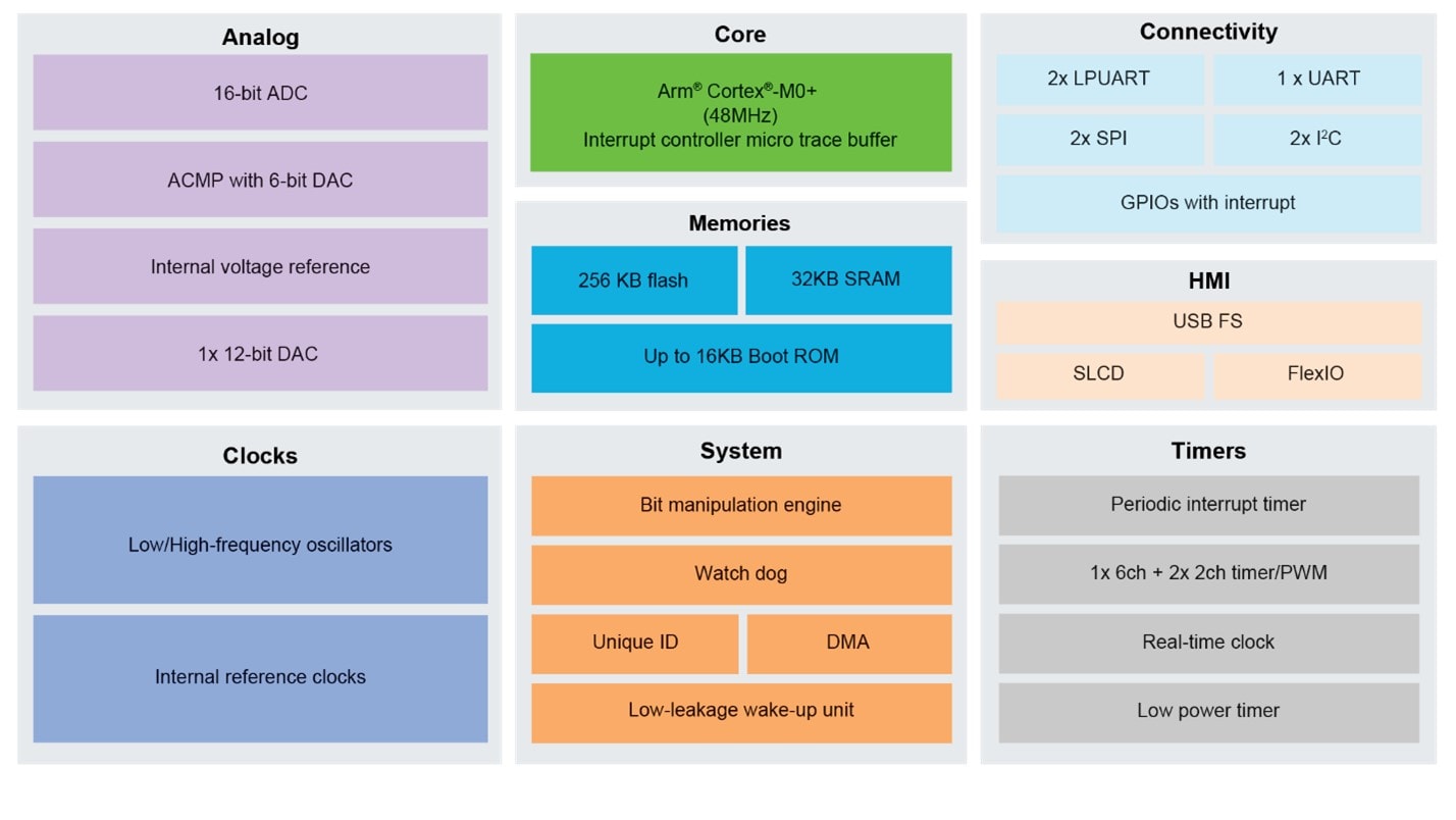 The MCX C has a wide range of communication and HMIs. USB operates at full speed (USB 2.0 at 12 Mbit/s) and a segmented LCD interface. FlexIO is provided for customizable interfaces and is capable of supporting a wide range of protocols, including, but not limited to, UART, I2C, SPI, I2S, Camera IF and PWM / Waveform generation.