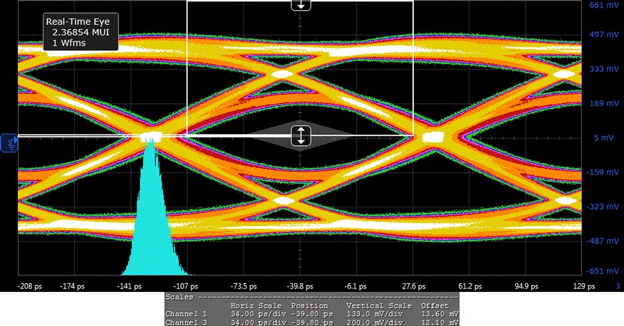 Fig. 5: Comparing the USB3.1 eye diagram at 10 Gbit/s for PCMF2USB3S on a test board.