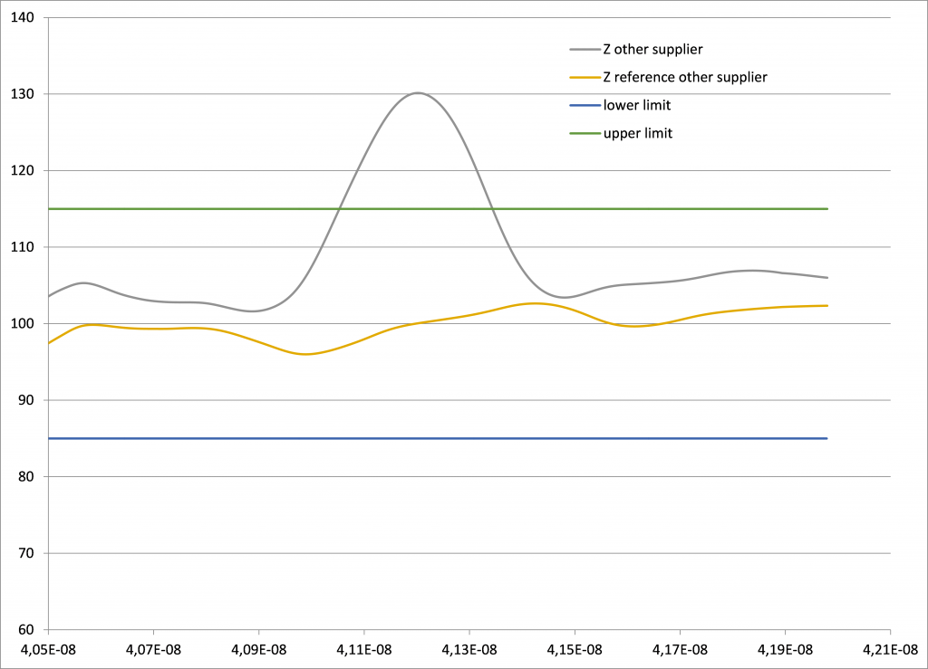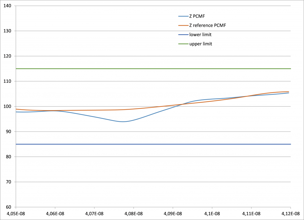 One example can be seen in Fig. 8, where the variation of the impedance over the running time (distance) is shown for two different integrated CMFs with ESD protection. For reference, the impedance of the test boards without Device under Test (DUT) is shown. While one device, PCMFxHDMI2S, shows the impedance dip that corresponds to a standalone ESD protection device with a very low capacitance, the other integrated CMF shows an inductive behavior, which violates the limits given by the HDMI standard.