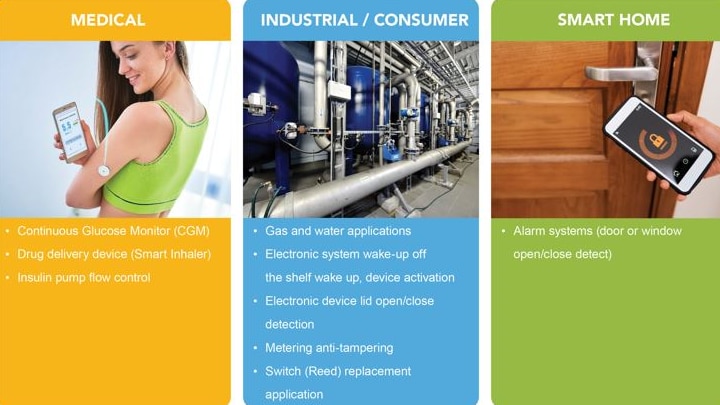 A key differentiator of the NMH1000 sensor is its flexibility. It can be used for medical, industrial, consumer and smart home applications. These include CGMs, continuous glucose monitoring, drug delivery devices such as a Smart Inhaler, electronic wake-up systems, gas and water flow applications, anti-tampering metering, reed switch replacement and alarm systems. The sensor can add new experiences to some of these applications. For example, the NHM1000 is handy in situations where smoke detectors are out of reach with no easy way to test their functionality. In this case, the sensor can be used with a telescoping magnet for testing from ground level. This can be done by positioning the magnet near the smoke detector to put it into test mode.
