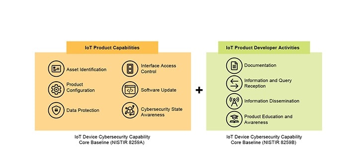 In addition to the capabilities of the end product and the associated components, the consumer profile outlined in the NIST 8425 standard incorporates the activities of the IoT product developer. This means the smart device manufacturer must put a company process in place around security, starting at the early stages of development with documentation of risk assessment, requirements and specifications, among other requirements. This process continues throughout the development cycle with a software bill of materials (SBoM), the conformance of the product to NIST 8425 capabilities and verification of the product against known vulnerabilities. Finally, it extends over the complete device lifecycle, with the ability to educate customers and others in the IoT product ecosystem about cybersecurity related information, as well as inform customers about how to use the product securely, alert the public and customers about relevant cybersecurity information and events (e.g. updated terms of support, breach discovery, needed maintenance operations, etc.), or receive reports of issues impacting the product's security.