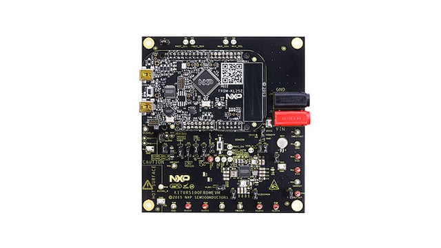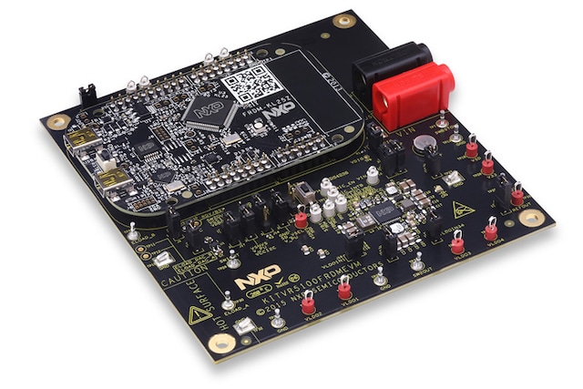 The KITVR5100FRDMEVM Evaluation Board (EVB) is an easy-to-use circuit board allowing the user to exercise all the functions of the VR5100 Power Management IC’s (PMIC). The EVB integrates the popular KL25Z FRDM Board. The FRDM Board is used as an interface between the GUI and the VR5100. Analog-to-Digital Converters (ADCs) in the KL25Z FRDM Boards are used to monitor the regulator voltages through the GUI.