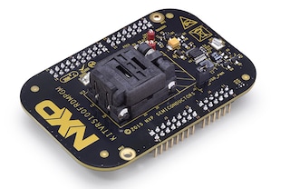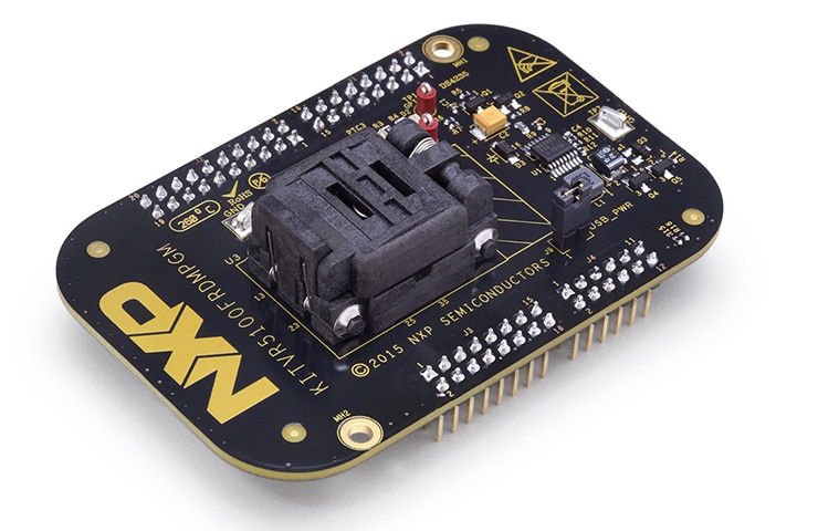 The KITVR5100FRDMPGM Programming Board is an easy-to-use circuit board allowing the user to program the VR5100 Power Management IC. The programming board integrates the popular KL25Z FRDM Board. The FRDM Board is used as an interface between the GUI and the VR5100. Analog-to-Digital Converters (ADCs) in the KL25Z FRDM Boards are used to monitor the regulator voltages through the GUI.