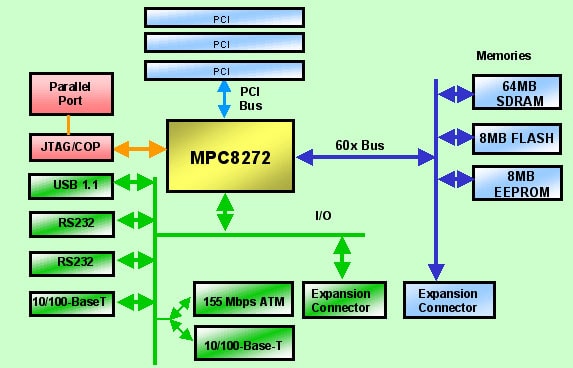 The MPC8272ADS board has 64MB of SDRAM attached to the 60x bus (soldered onboard) and an 8MB Program Flash SIMM (supports up to 32MB). The on-board interfaces include JTAG/COP, Dual UART, USB 1.1, two 100/10-Base-T Fast Ethernets, and a 155 Mbps ATM UNI with optical interface.