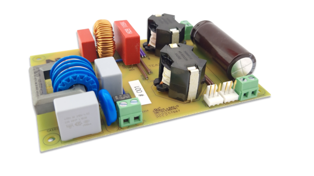 The TEA2376DB1602 is a 300 W/395 V interleaved PFC power supply demo board. It showcases the TEA2376DT interleaved PFC controller IC and the TEA2209 active bridge controller IC. With a Windows OS PC in combination with the RDK01DB1563 USB I²C interface, the behavior of the TEA2376 controller can be modified by settings and status information of the power supply can be collected.
