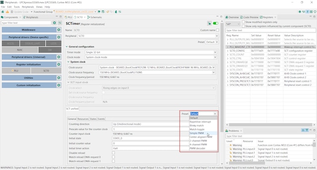 examples of PWM timer implementations using the SCT, and the MCUXpresso