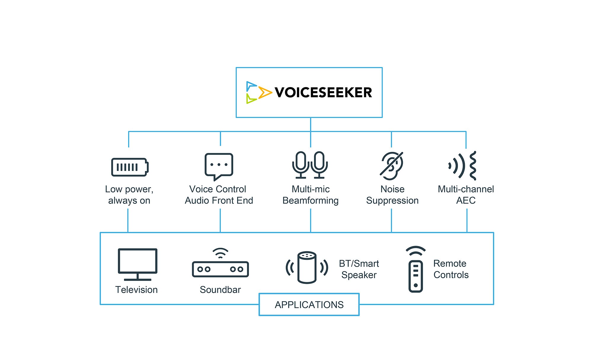 VoiceSeeker is a multi-microphone voice control audio front-end signal processing solution. VoiceSeeker provides high performance beamforming and multi-channel acoustic echo cancellation (AEC) to enable reliable trigger word detection and payload accuracy. VoiceSeeker does not require pre-determined fixed microphone geometries, making it an ideal choice for customers who need flexibility in microphone placement. Effective at up to 10 meter and beyond, VoiceSeeker’s beamformer is the optimized for far-field voice control.
