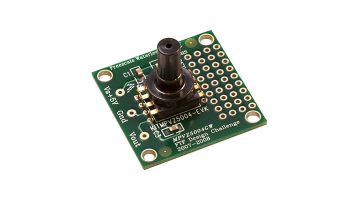KITMPVZ5004EVK is a simple waterlevel evaluation board designed for easy connection to the pressure sensor. The filter circuitry has been added to the output of the sensor, and the only connections required are +5V, Ground, and the Vout to an ADC. The media resistant sensor is designed to measure up to 40cm of H2O via a tube that should be connected to the port. More information on waterlevel can be found in our app note AN1950. For FTF Design Contest Participants, this can be used to get feedback when a waterlevel has reached a particular height, for control/feedback systems.