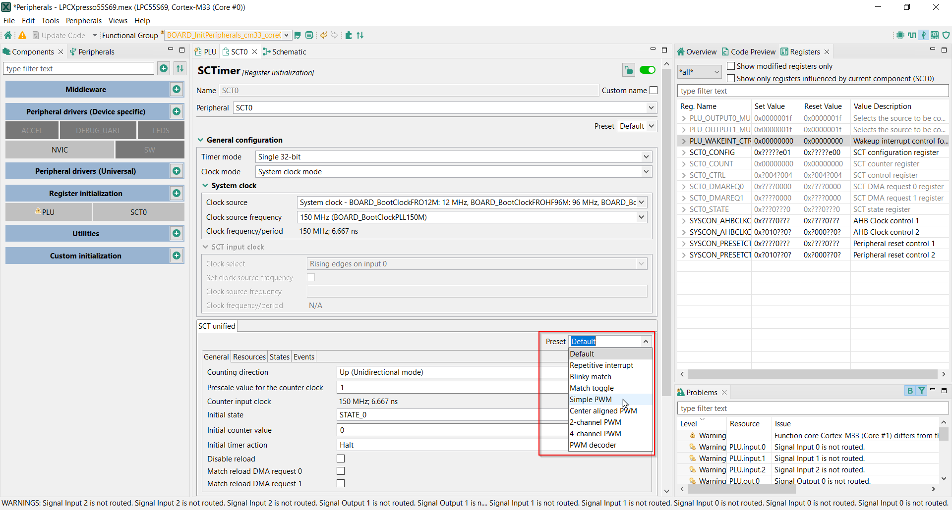 examples of PWM timer implementations using the SCT, and the MCUXpresso