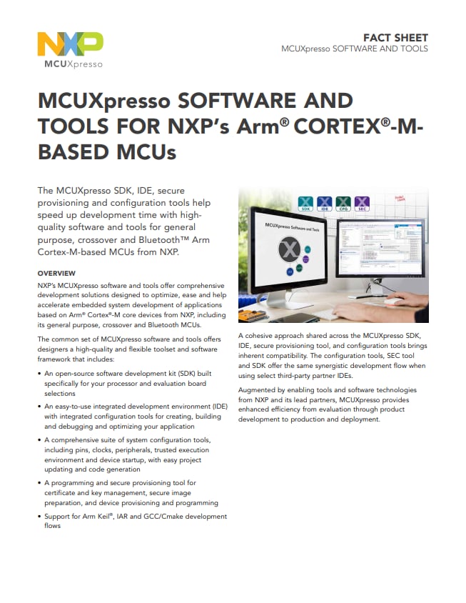The MCUXpresso SDK, IDEs, secure provisioning and configuration tools provide a leading developer experience, speeding up development time with high-quality software and tools for general purpose Arm® Cortex®- M-based products from NXP.