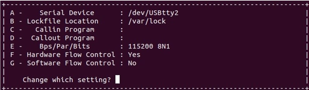 1$ sudo apt-get install minicom1$ sudo minicom /dev/ttyUSB* -s