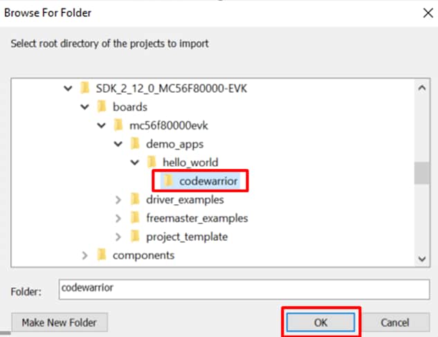 <SDK_Directory>/boards/ mc56f80000evk/demo_apps/hello_world, select codewarrior and click OK