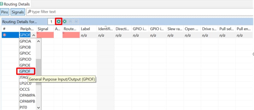 Option B: Add a new row directly in Routing details window, click the peripheral box and select GPIOF, then select GPIO,6 in the signal box.