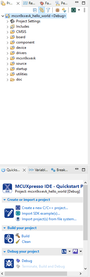 The built project output binary is flashed to the target board before launching a debug session. The Debug session provides controls and views to help the developer analyze the operation of the project. The following steps will show how to successfully flash and program the MCX N EVK evaluation kit.
