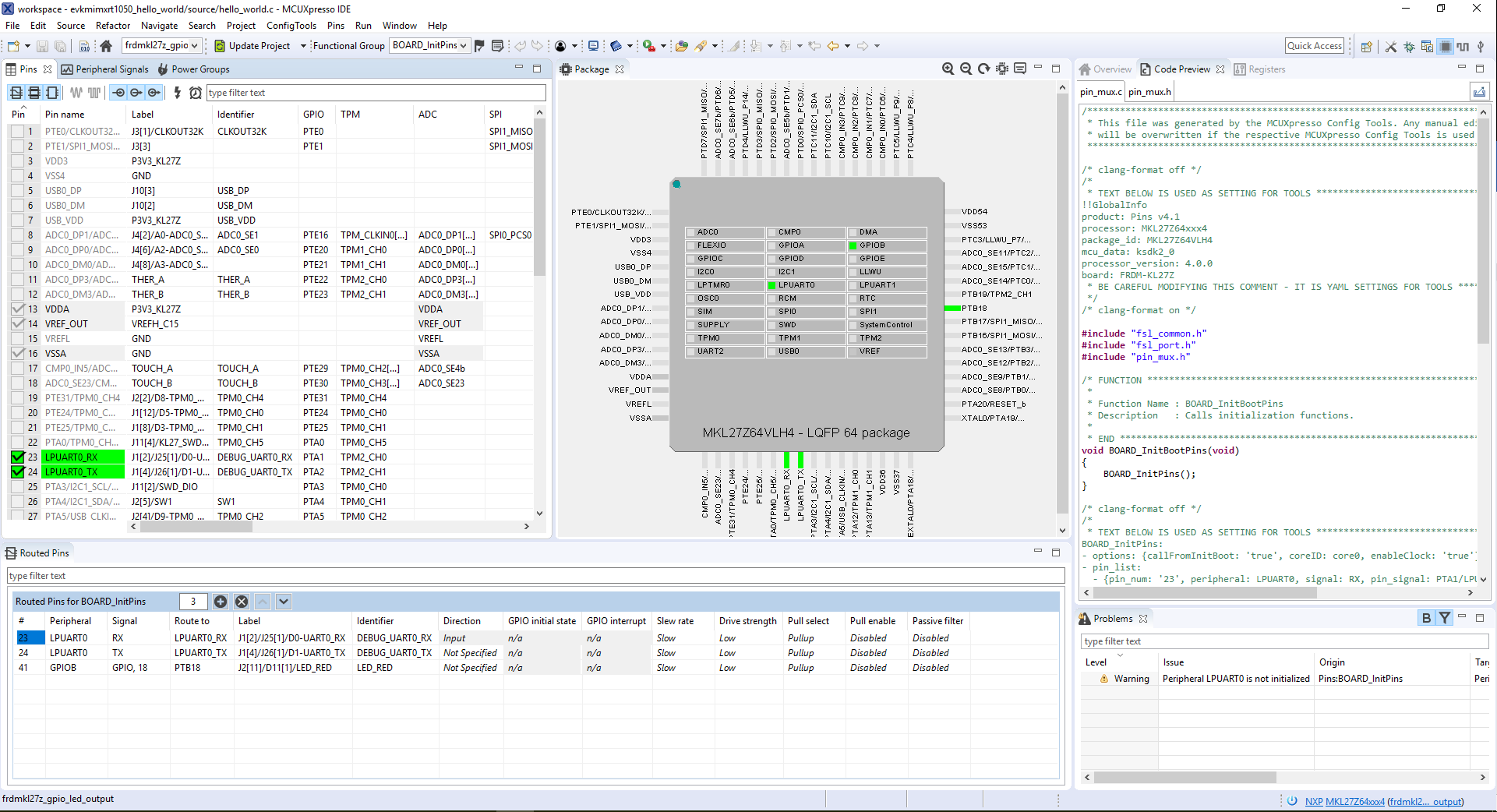 PTD5 pin. Use the #defines that are found in pin_mux.h where were created by the Pins Tool#define BOARD_LED_GPIO BOARD_INITPINS_MY_LED_GPIO