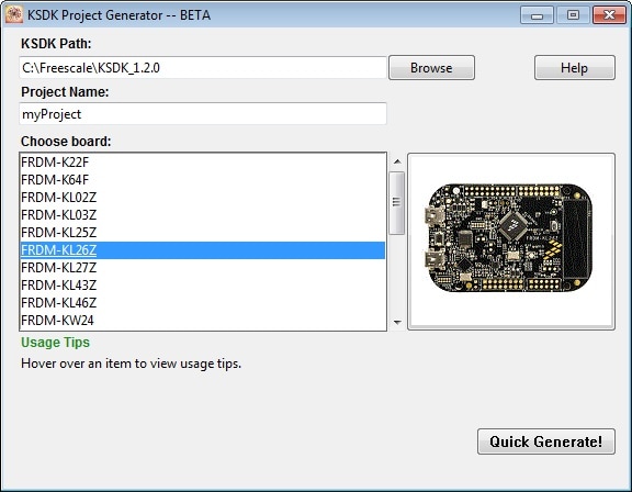 After extracting the ZIP file, open the utility by clicking on the 'KSDK_Project_Generator' executable for your computer's operating system. Point the tool to your SDK installation path, name your project, and select the board that it uses as a reference. Click on the Quick Generate button to finish.