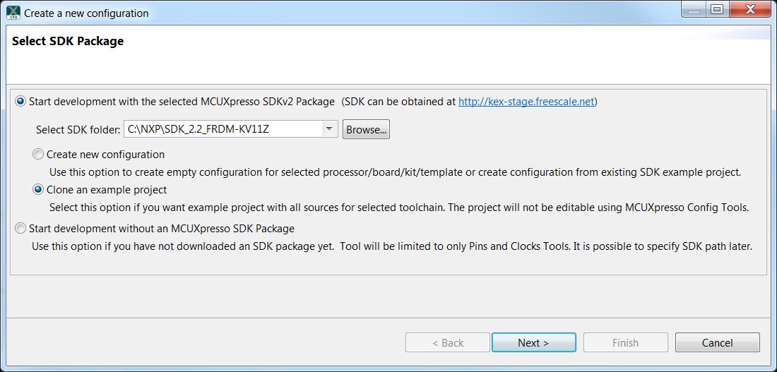 To clone an existing demo app or driver example for use with a third-party IDE use MCUXpresso Config Tools.