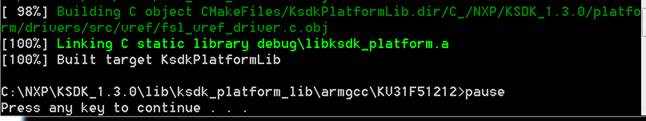 <install_dir>/lib/ksdk_platform_lib/armgcc/KV31F51212/debug<install_dir>/lib/ksdk_platform_lib/armgcc/KV31F51212/releaseKSDK demo applications require that the platform library for the same build target (Debug or Release) is present. Please ensure that you follow the steps in previous sections to attempting to build a demo application. To build an example application, follow these steps: