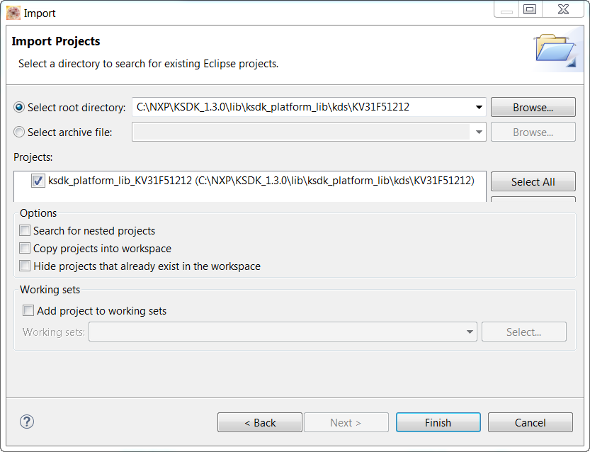 <install_dir>/boards/KV31F512/demo_apps/hello_world/kdsAfter pointing to the correct directory, your "Import Working Sets and Projects" window should look like the figure below. Click the "Finish" button