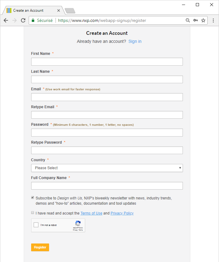 If you already have an account press LOGIN NXP SSO and you will be automatically redirected to the NXP Sign In