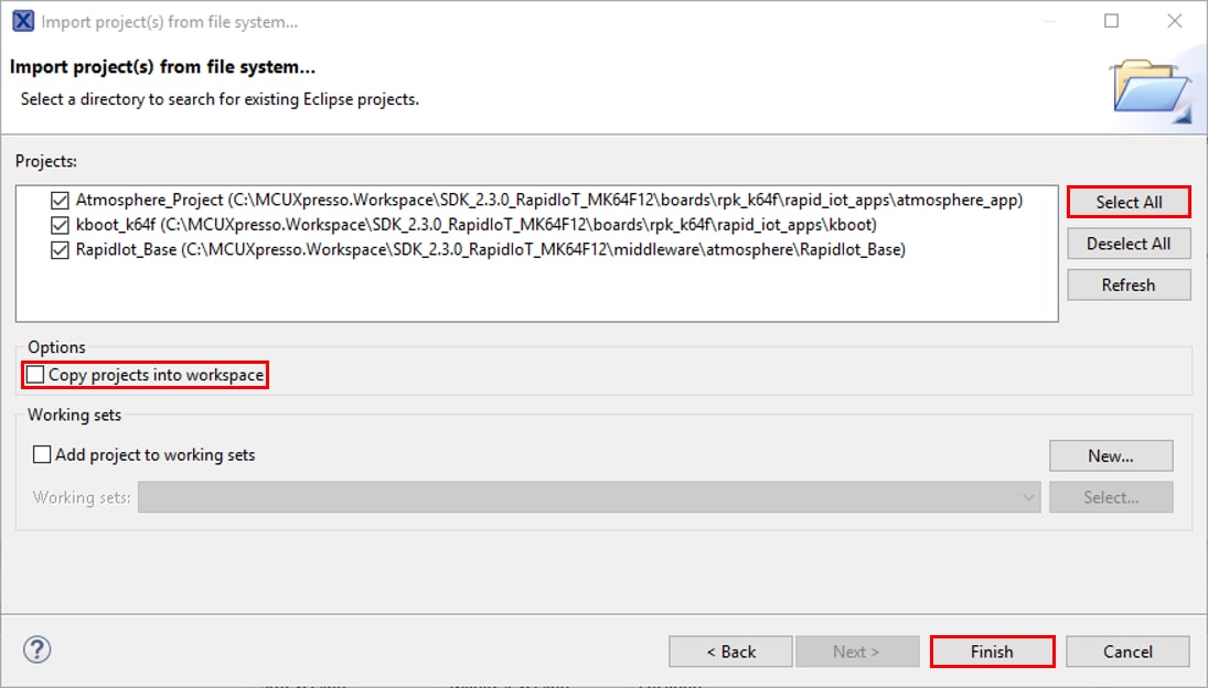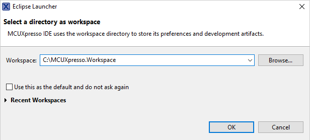 Launch MCUXpresso IDE and define the Workspace location (default C:\MCUXpresso.Workspace) and press OK.