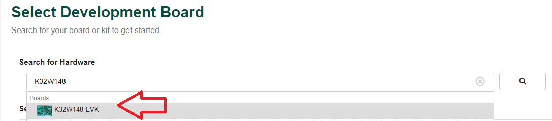 In the Search for Hardware search box, type in the selected board “K32W148-EVK”. Click on the board to select it.