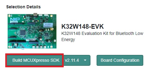 On the right hand side you will see the option to build the SDK for the K32W148-EVK. Click on this button to add the middleware needed.