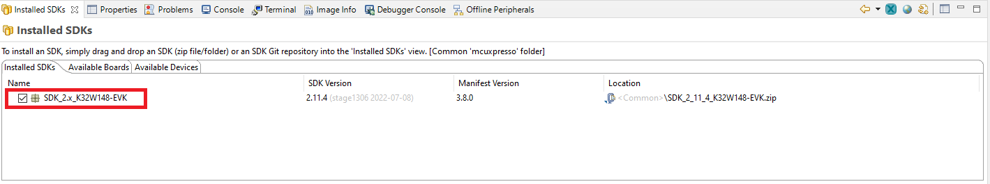 Once the SDK package has been downloaded, drag and drop to the “Installed SDKs” window in the MCUXpresso IDE.