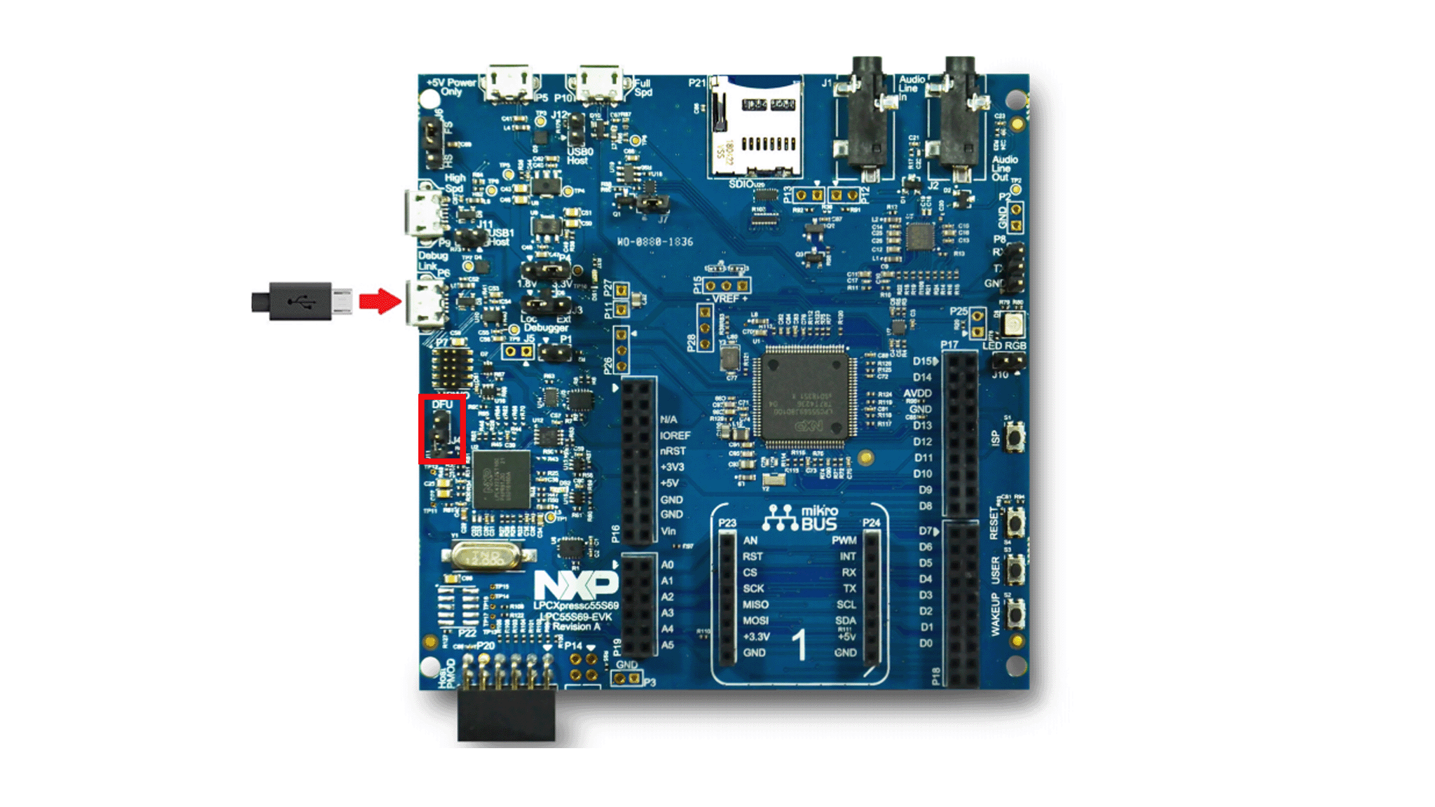 Your LPCXpresso54S018M board comes preloaded with a “Spirit Level” application and on-board diagnostic