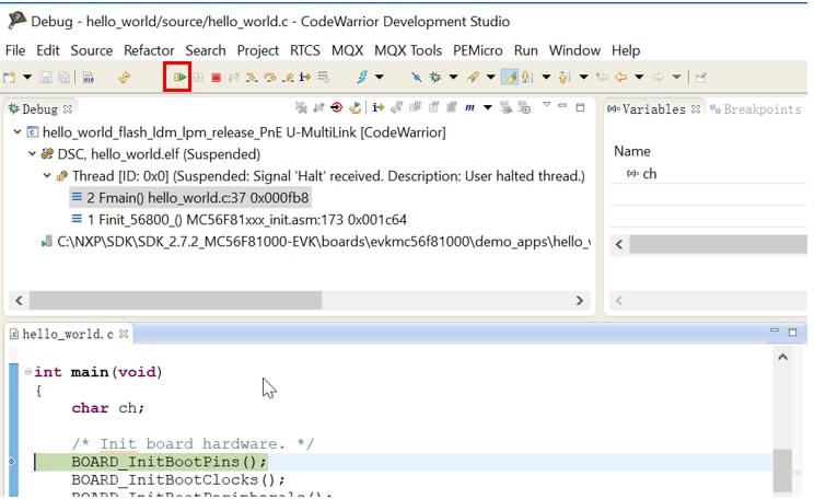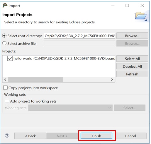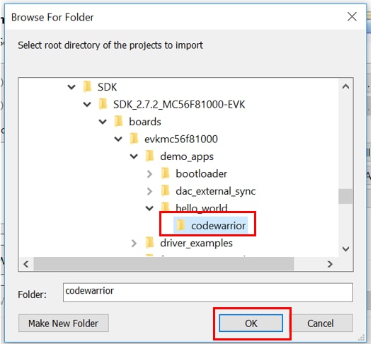 SDK_Directory/boards/ evkmc56f81000/demo_apps/hello_world , select codewarrior and click OK.Note:Don’t modify the project here, otherwise the SDK package will be changed. Don’t send this project to others, because it’s a linked project to your SDK package. See next section about how to create a new standalone project.