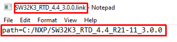 C:\EB\tresos\links folder with the content: "path=C:/NXP/SW32K3_RTD_4.4_x.y.z