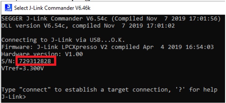 *Your device serial number may be different. You can obtain the device serial number, by opening Jlink.exe (with your MIMXRT595 already connected through J40).