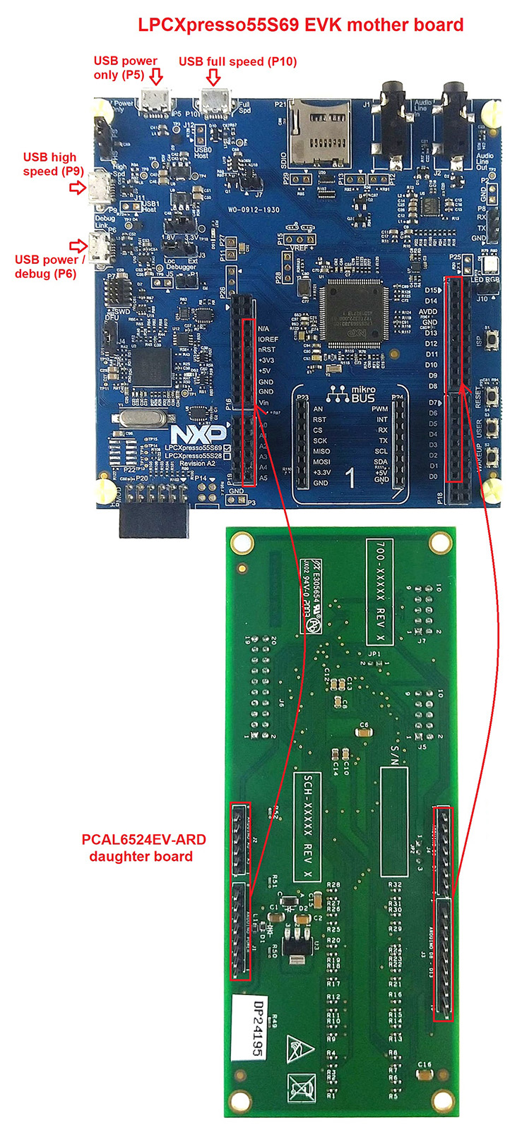 Figure 3 shows the required hardware for operation of the PCAL6524EV-ARD and LPCXpresso55S69 EVK board. This configuration consists of: