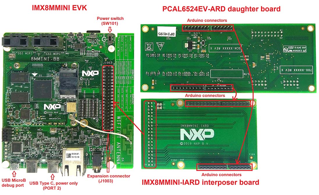Note: For i.MX Mini LPDDR4 EVK board, it is necessary to use IMX8MMINI-IARD interposer board between the EVK and PCAL6524EV-ARD daughter board (see IMX8MMINI-IARD User Manual).