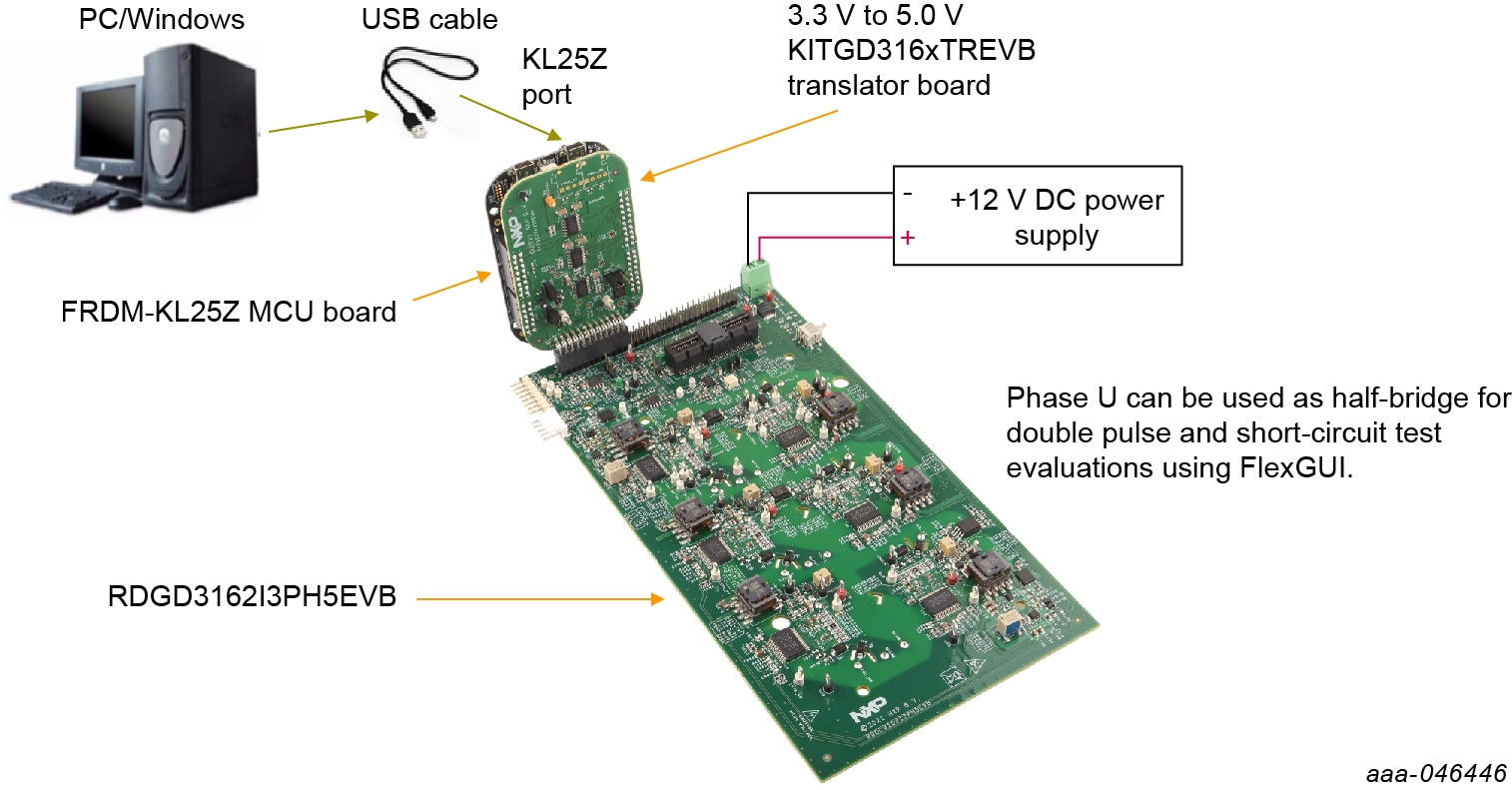 RDGD3162I3PH5EVB is connected to a KITGD316XTREVB translator board and a FRDM-KL25Z board as shown in the following figure.