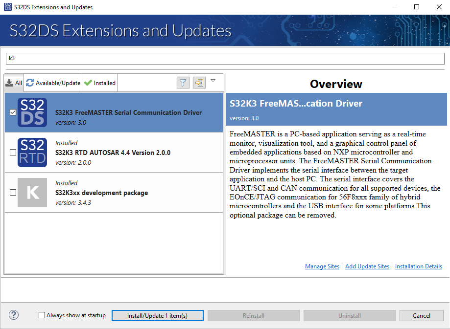 Open S32DS Extensions and Updates dialog (menu → Help → S32DS Extensions and Updates), click on Add Update Sites link and navigate to FreeMASTER communication driver for S32K3 (zip file starting with "com.") on your disk.
