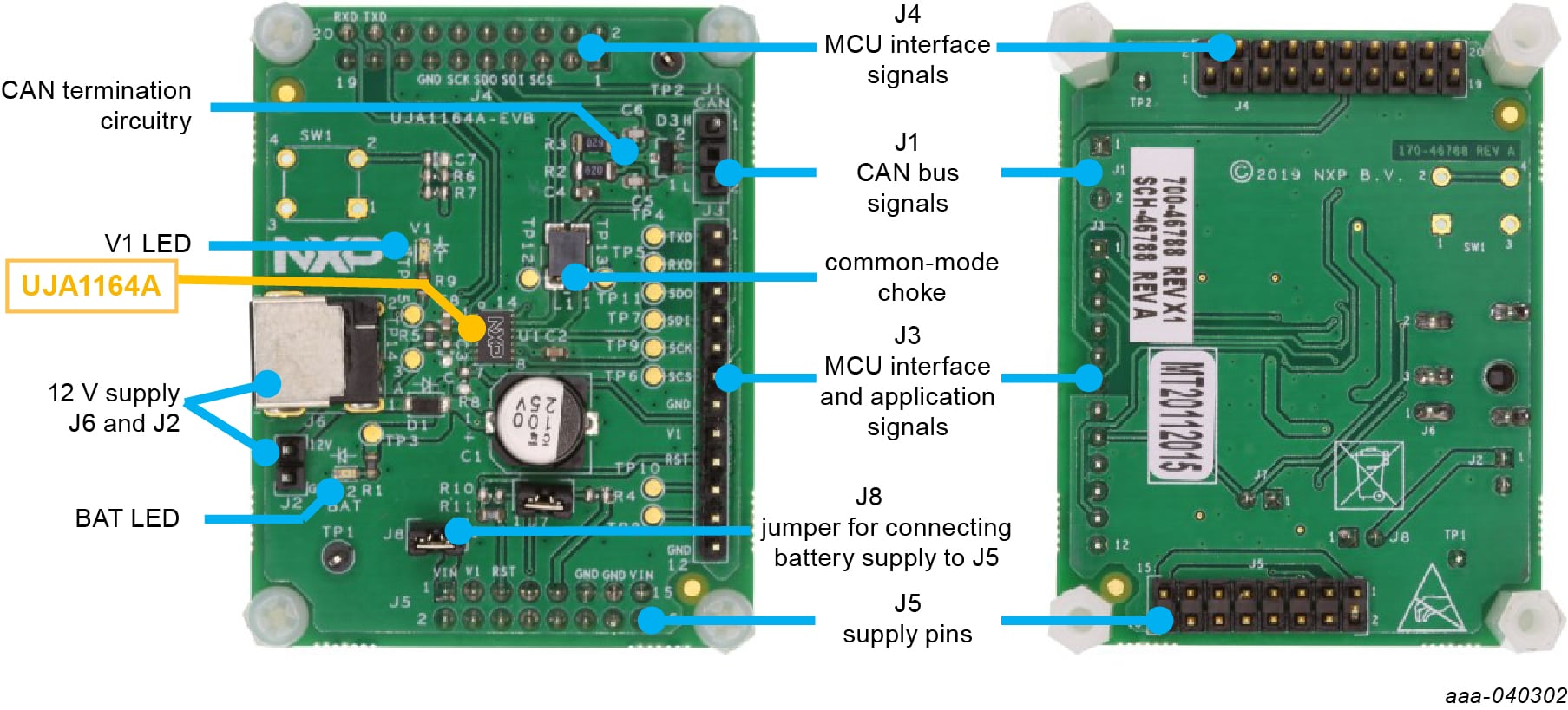 J3-03, J4-09) → MISOJ3-04, J4-07) → MOSIJ3-05, J4-11) → SCKJ3-06, J4-05) → CSJ3-01/J3-02, J4-18/J4-20) pins to the MCU CAN controller TXD/RXD pinsJ9-09/J5-05) to the MCU reset pinJ1-01/J1-02) to the CAN bus twisted pair cablesJ3-08, J5-03) to the MCU supply unitOnce the above steps have been completed, the ECU/EVB can be powered up using an external battery supply. The UJA1164A-EVB starts up in Forced Normal mode (if MTP is not configured) or Standby mode (if MTP configured), awaiting commands from the MCU via the SPI interface.
