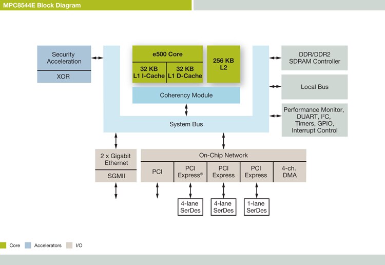 The MPC8544E processor offers a wide range of high-speed connectivity options, including Gigabit Ethernet (GbE) interfaces with SGMII support and multiple PCI Express® connections. Support for these high-speed interfaces should enable scalable connectivity to network processors and/or ASICs in the data plane while the PowerQUICC III is designed to handle complex, computationally demanding control plane processing tasks. The MPC8544E is also designed to provide support for legacy PowerQUICC III interfaces such as PCI, I²C, dual universal asynchronous receiver/transmitters (DUART) and local bus connections. These processors are also designed to feature a next-generation double data rate (DDR2) memory controller, enhanced GbE support, v2 e500 double precision floating point and the field proven 90 nm PowerQUICC III integrated security engines.