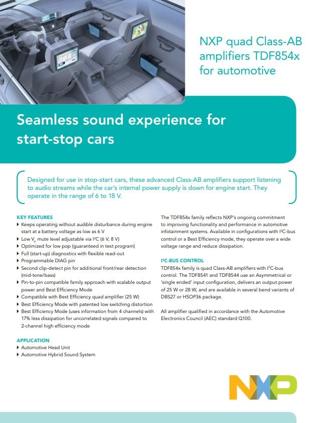 reenter your passwordHigh-Performance Automotive Audio Amplifiers for a broad range of in-vehicle applications. NXP's automotive audio amplifier portfolio delivers the power, efficiency and reliability needed to meet the demands of today's in-vehicle sound systems. From high-fidelity Class AB to energy-efficient Class D amplifiers, our solutions are designed to support a wide range of audio architectures—from entry-level systems to premium branded audio.