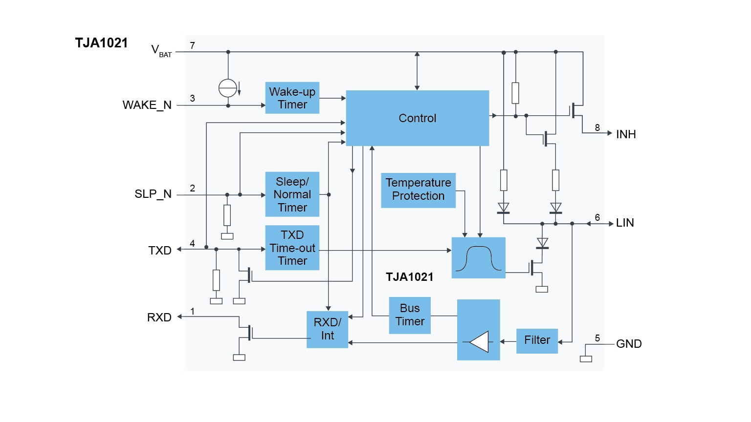 The transmit data stream of the protocol controller at the transmit data input (TXD) is converted by the TJA1021 into a bus signal with optimized slew rate and wave shaping to minimize electromagnetic emission (EME). The LIN bus output pin is pulled HIGH via an internal termination resistor. For a commander application, an external resistor in series with a diode should be connected between pin INH or pin VBAT and pin LIN. The receiver detects the data stream at the LIN bus input pin and transfers it via pin RXD to the microcontroller. In Sleep mode, the power consumption of the TJA1021 is very low. In failure modes, the power consumption is reduced to a minimum.
