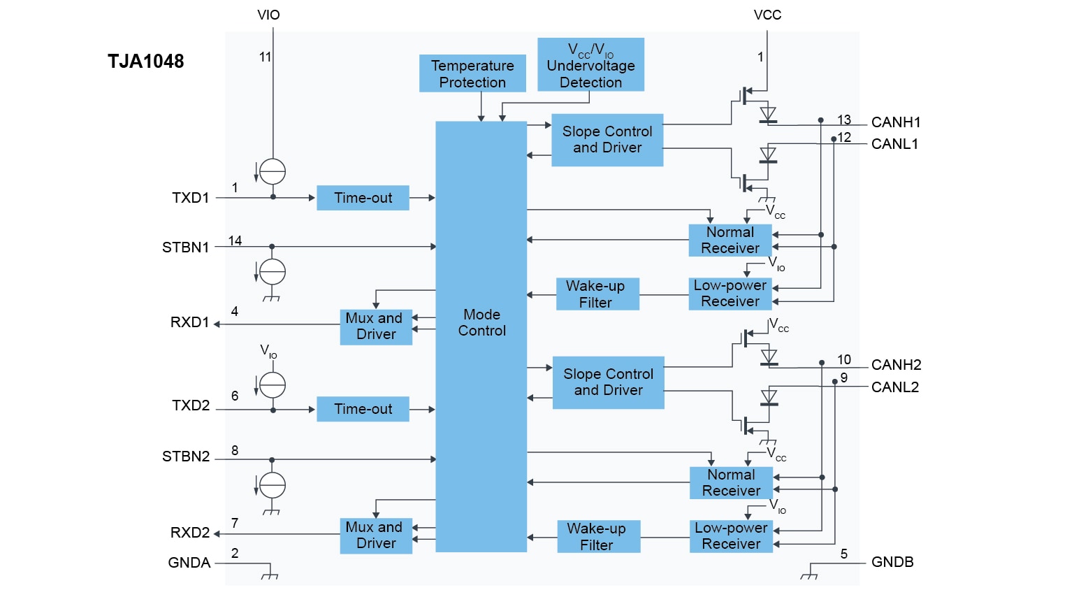 • Two TJA1042/3 HS-CAN transceivers combined monolithically in a single package