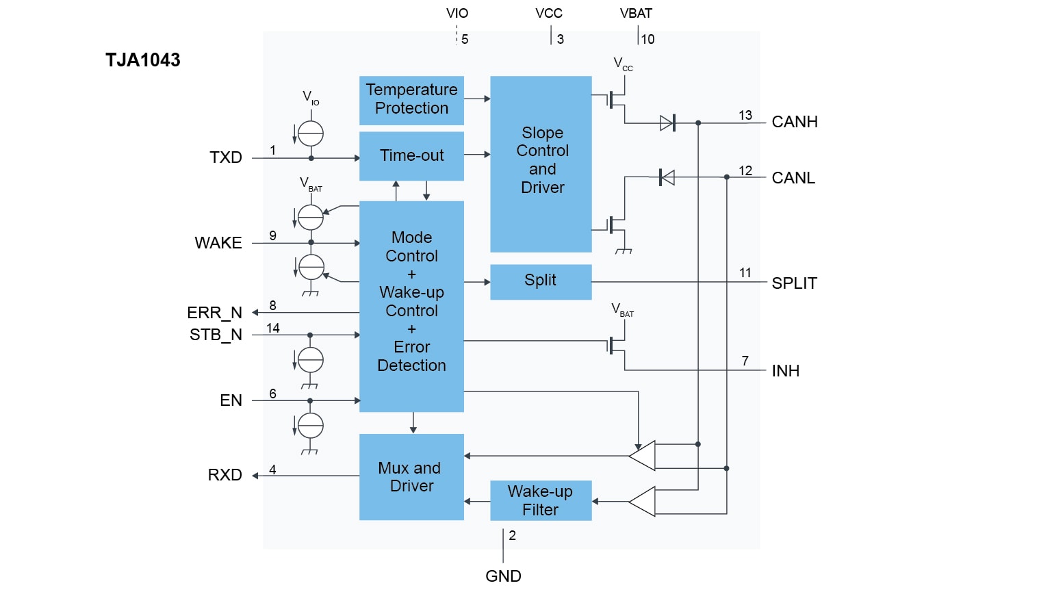 These features make the TJA1043 the ideal choice for high speed CAN networks containing nodes that need to be available all times, even when the internal VIO and VCC supplies are switched off.