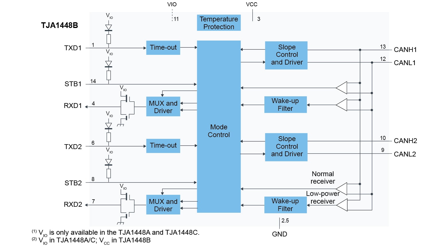 The TJA144x family of transceivers provides an interface between a controller area network (CAN) or CAN flexible data rate (FD) protocol controller and the physical two-wire CAN-bus.